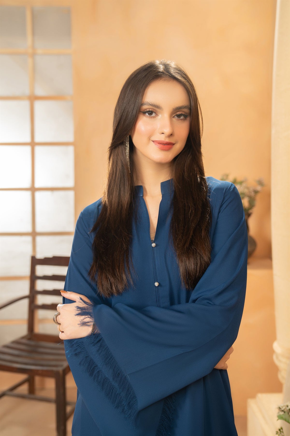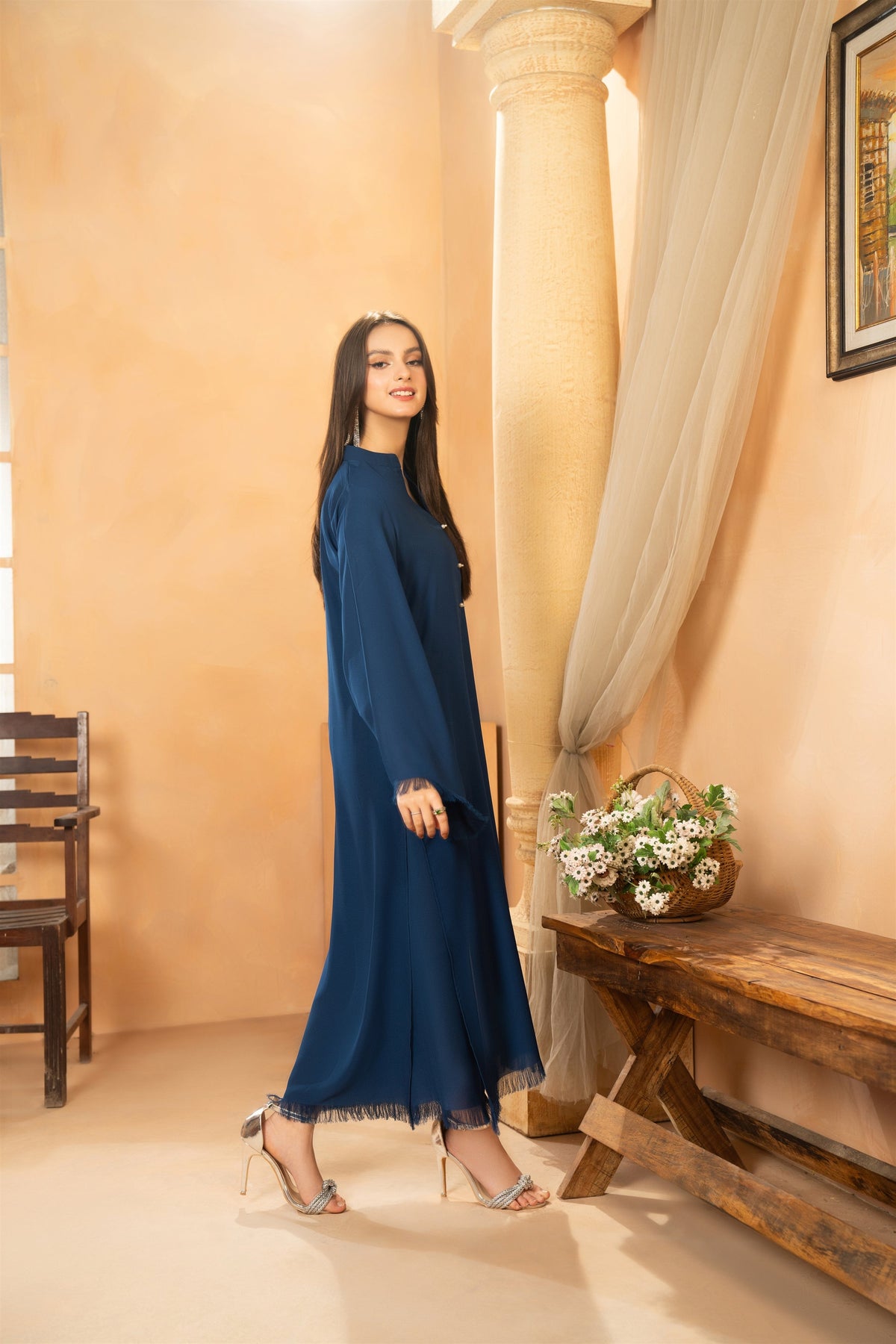 Embrace the season’s splendor in this silhouette adorned in silky georgette and fringe details on the sleeves daman and trousers’ bottom.