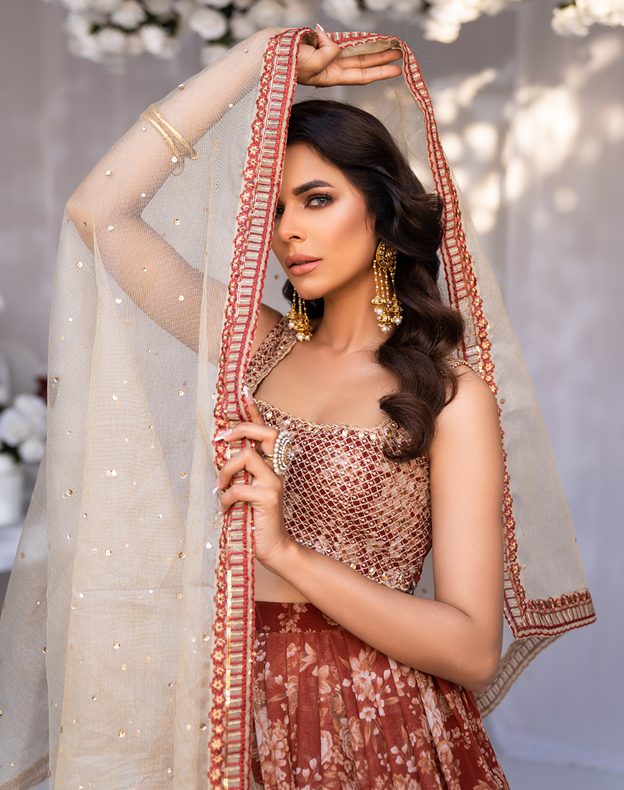 Rose Blush - Step out in style with this glamorous rose gold dream come to life. A heavily embroidered choli featuring crystals and pastel hues. The printed lehenga has intricately embroidered borders, and the zari net dupatta is embellished with Swarovski crystals and delicate embroidery. The tassels at the back add playfulness to the outfit. Pair with understated jewelry for a refined look.